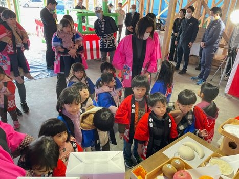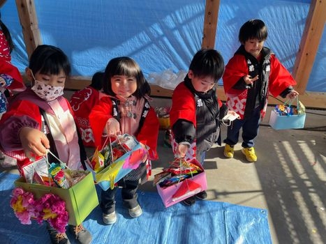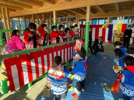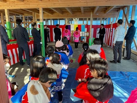 上棟式には、りんご組、かき組の子どもたちが参加し、工事に携わってくださる方への感謝の気持ちを持ちながら、工事の安全と完成を祈願しました。