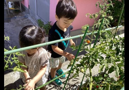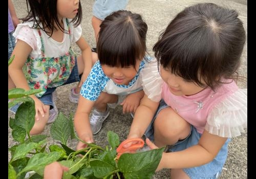 ピーマンは茎をハサミで、トマトはヘタの上を手で収穫。そーっと慎重に収穫する子どもたちの姿から、優しさが伝わります。