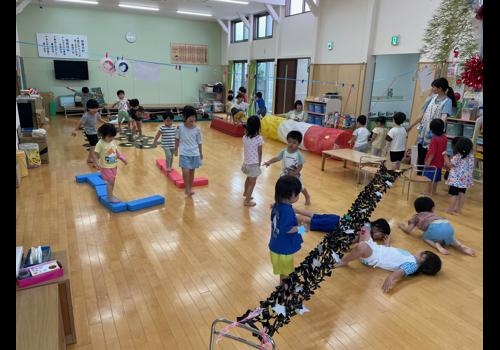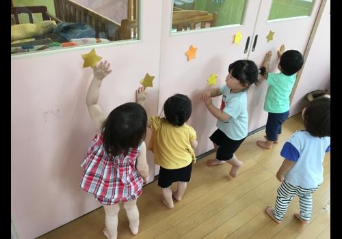 七夕会では、お星様をペタペタ貼ったり、絵本を見たり、天の川に見立てたサーキット遊びで七夕の雰囲気を存分に楽しんだ一日になりました。