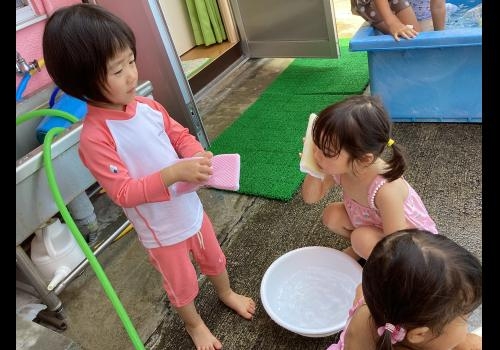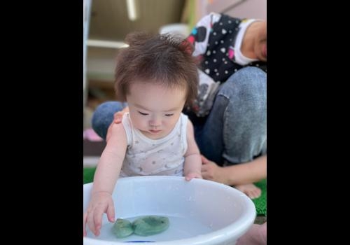 0.1.2歳児は、たらいに水をはり、浮かべたスポンジを使って水の感触や冷たさ、太陽の光に反射した水の変化を楽しみます。