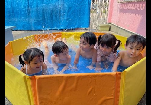 初めはおっかなびっくりだった水あそびも、明るい声とともに水しぶきを立て楽しめるようになり成長の喜びが感じられます。