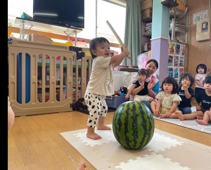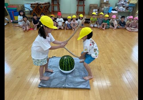 小さい子も負けていません。棒を振りかざして勢いよくスイカをたたきます!